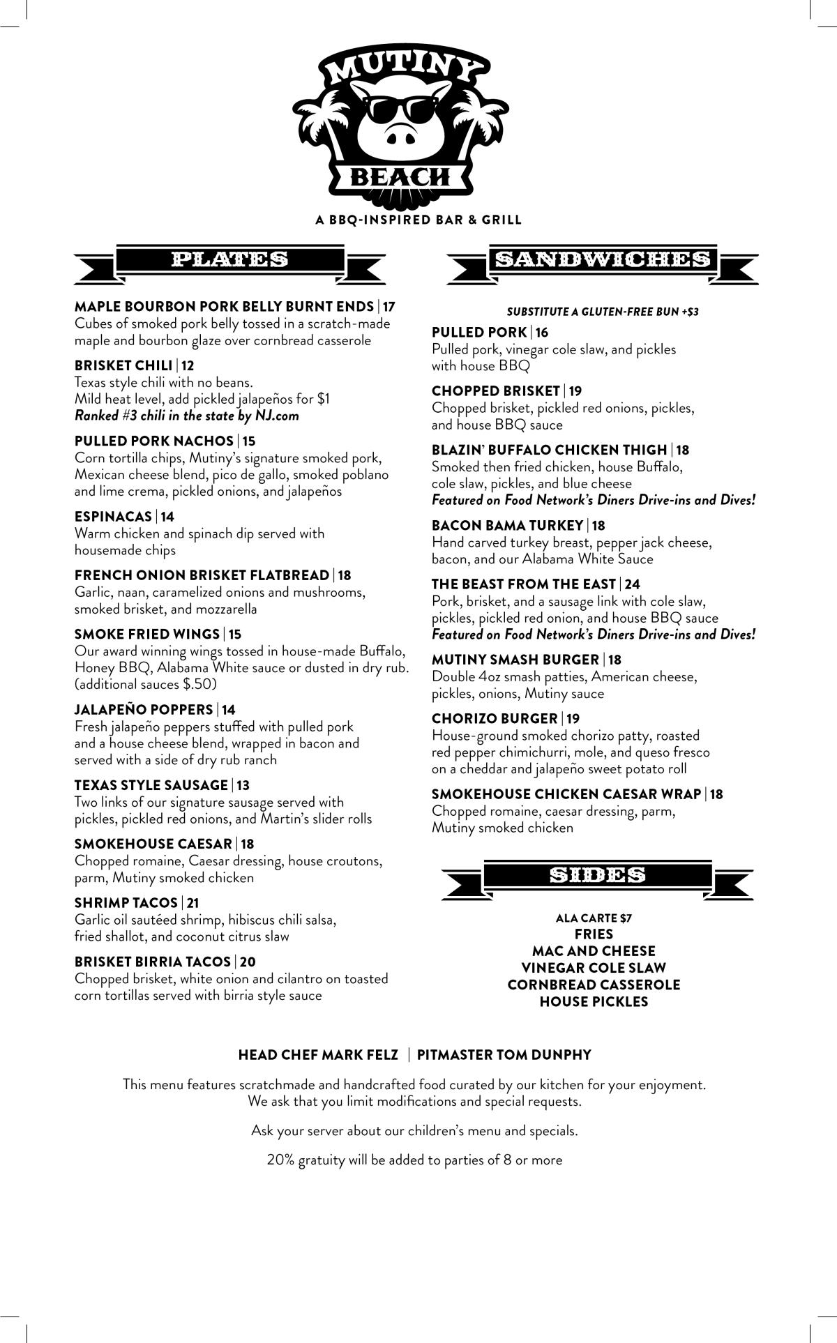 Mutiny Beach’s culinary approach blends high quality ingredients, unique flavors, and modern technique with the old school tradition of a real deal barbecue smokehouse in a casual, comfortable setting inside Asbury Park’s historic Convention Hall.